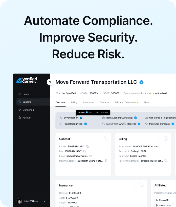 Verified Carrier™ sets the standard for carrier compliance by making sure every carrier meets essential requirements like authority, insurance, and safety records. Our platform does the heavy lifting, while our human-centric review process adds another layer of care. This way, you can trust that carriers are fully compliant and safe to work with.